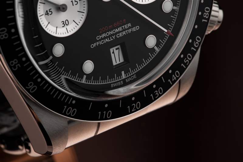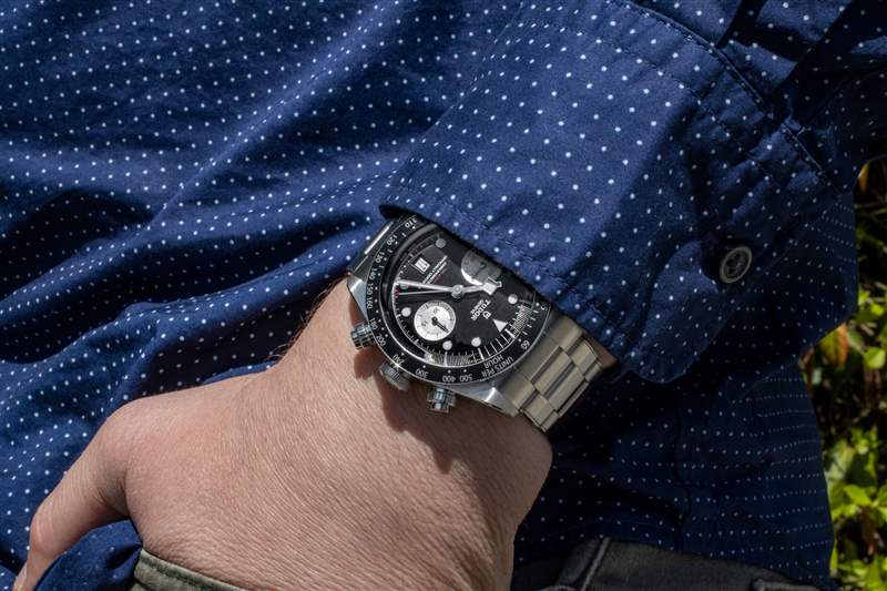 在每個表盤版本中,潛水腕表風格的雪花指針雖然設計為低光下一目了然,但部分遮擋了45分鐘計時碼表累加器從大約兩分鐘的位置到30分鐘的位置。這是杰克在《手腕上》中花了一部分時間與第一款黑灣計時碼表一起思考的事情。他的故事是一本很棒的讀物,所以請看看。它包含許多與這兩款手表以及它們來自哪里相關的信息。雖然有問題的手比他想要的更能阻止45分鐘寄存器的讀數,但杰克發現這是一個涉及日常使用的小問題。
