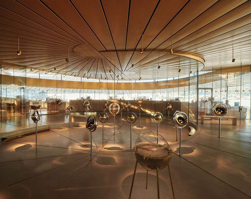 這棟有著玻璃帷幕的螺旋式結構展館,將博物館與工作坊和諧地納于其中。「此建筑和場景設計蘊含的技術內涵,與大復雜功能腕表的機芯遙相呼應。」Audemars Piguet歷史遺產(chǎn)及博物館總監(jiān)Sébastian Vivas與我們分享道。