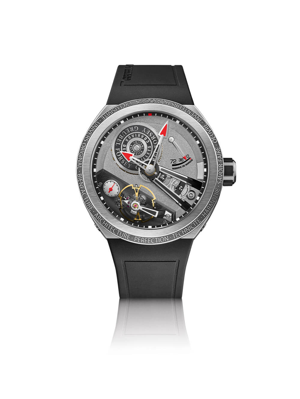與 GMT Sport 一樣,時針和分針經過彎曲處理,以適應藍寶石水晶的形狀,并安裝在鏤空夾板的頂端,該夾板位于表盤中心上方,用作手表的格子架。運動工作輪爬。三點鐘位置有一個動力儲存指示器,旁邊是主發條盒的輪廓,浮雕上刻有文字。Balancier S 配備雙同軸串聯發條盒,可提供 72 小時動力儲存。