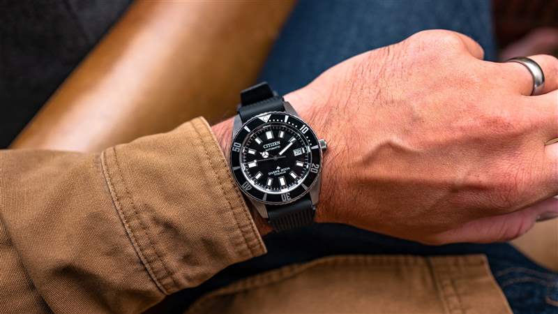 一旦我把這個Citizen戴在我的手腕上,外觀與表殼的超現(xiàn)實(shí)輕盈相結(jié)合,提供了手腕的存在感和耐磨性,掩蓋了1970年代誕生的任何東西。表殼寬41毫米,凹陷式拱形藍(lán)寶石水晶玻璃表鏡頂部厚度12.2毫米,表耳間距為48.5毫米。這些是通??纱┐鳚撍直淼恼1壤?,但得到這個,在橡膠表帶上,挑戰(zhàn)潛水員僅重70克。作為參考,我的精工SPB143的尺寸手鐲重82克。只是手鐲。