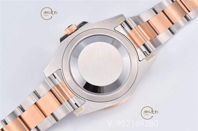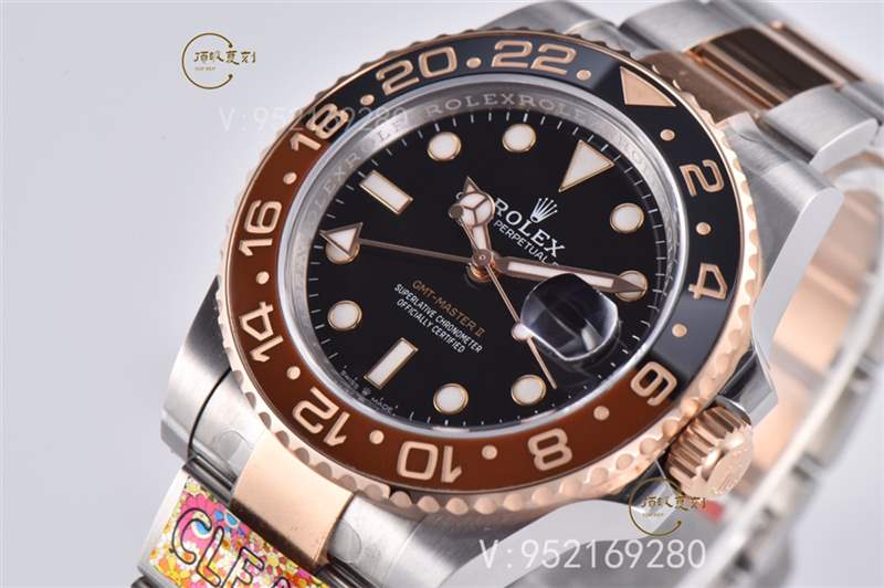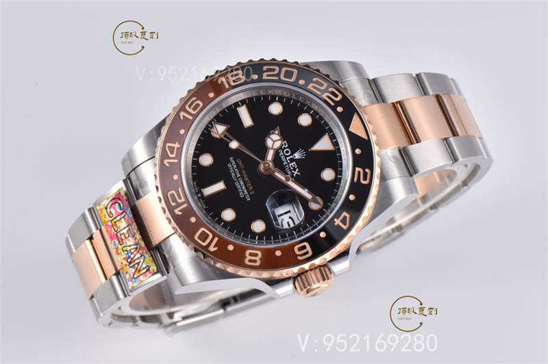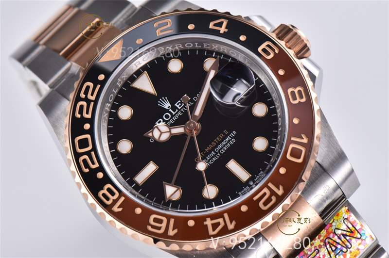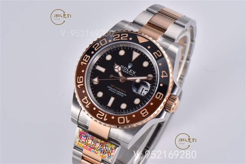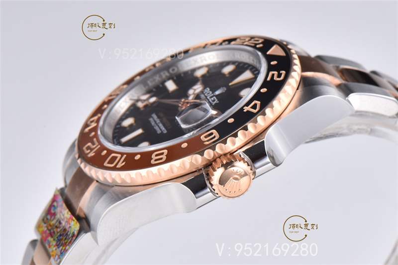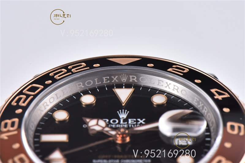 - 對于此次對于腕表陶瓷圈口方面來說,也是很為到位的細節,黑色部分無色基,乃至棕色部分也基本是無色差,絕對沒有調色的嫌疑, 有正品的表友可以拿到實物對比, 所有的數宇刻度的深淺,宇形做的都較為接近,以及電銀的玫瑰金色。 整個陶瓷圈,為一體燒制 的陶瓷園,非拼接。黑色和棕色,甚本達到了一個沁色的效果,為了這個工藝也是嘗試了 無數次。 關于黑/棕 相交的部分,因為開模是同時購買丁兩枚原裝,原裝的界線部分是彎曲的,當 時看到我們也很院異,但是這的確是真品的工藝,并且只要棕色部分于數宇8相交,而叉不超過數宇8刻度里面上下兩個大小0,即為真品工藝,因為雙色燒制陶瓷圖要考慮陶瓷的收縮比,即便是真品也很難把握分寸!