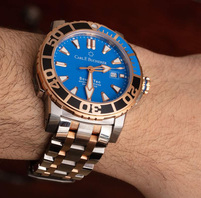 Patravi ScubaTec 是位于盧塞恩的Carl F. Bucherer 的高端潛水表系列。目前最受鐘表愛好者歡迎的就是Carl F. Bucherer款。與許多努力探索新設(shè)計的豪華時計一樣,Patravi ScubaTec 在近十年前最初發(fā)布時并沒有立即取得成功。今天,隨著 Carl F. Bucherer 將其大部分營銷重點(diǎn)轉(zhuǎn)移回西方(包括歐洲和美國),Patravi ScubaTec 等型號(此時手表有許多變體)將成為那些時計這將引起很多關(guān)注。今天,我回顧了一款帶有亮藍(lán)色表盤的雙色鋼和 18k 玫瑰金 Patravi ScubaTec,參考 00.10632.24.53.21。