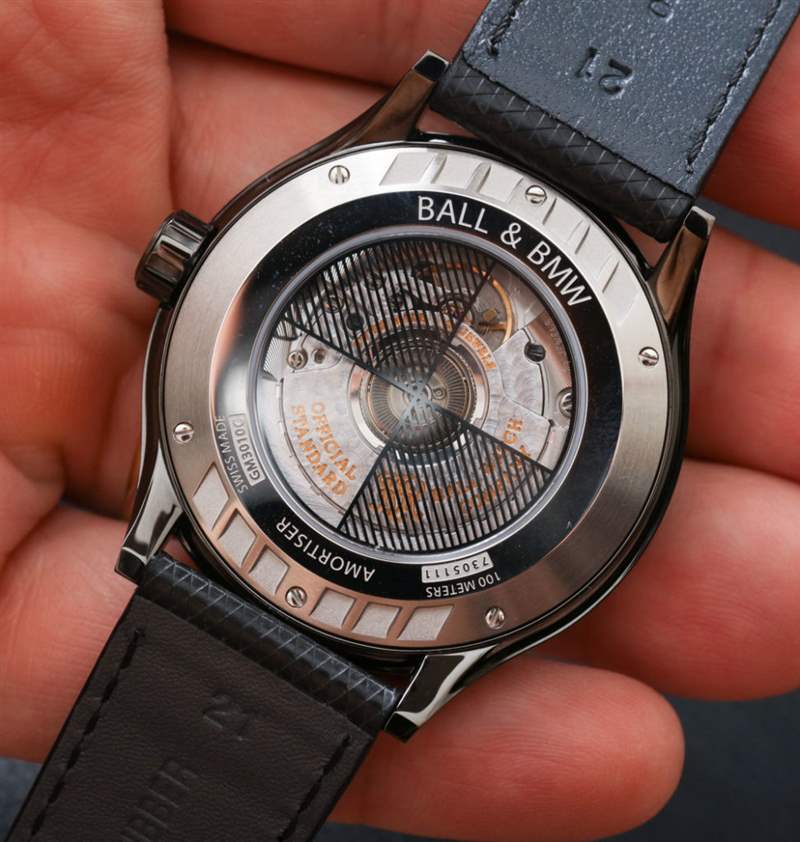 鑒于這是一款 Ball 手表(除了表盤上的 13 個氚氣管之外),表殼還增加了一些耐用性。防水深度達 100 米,表殼抗磁能力達 4,800 A/m。更有趣的是為機芯使用了一個特殊的減震固定環,在這種形式下,Ball 獲得了專利,被稱為他們的 Amortiser 防震系統。這個想法是為了保護機芯免受劇烈振動以及光線跌落等的沖擊。