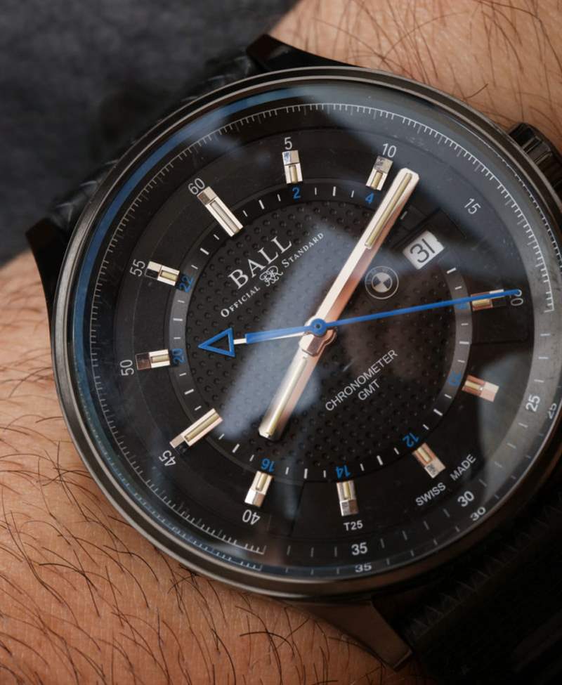 Ball For BMW GMT 寬 42 毫米,厚 12.64 毫米,是一款舒適且多功能的手腕時計。相對較薄的表圈可提供最大的表盤空間,既清晰又寬敞。Ball 設計了這款和其他帶有復雜表盤的 Ball For BMW 手表,盡管各種紋理和裝飾元素并沒有真正妨礙易讀性。這在一定程度上要歸功于寬大的指針和突出的時標。請注意,這些當然是 Ball 手表,這意味著它們在時標和指針上都使用自發光氚氣管。