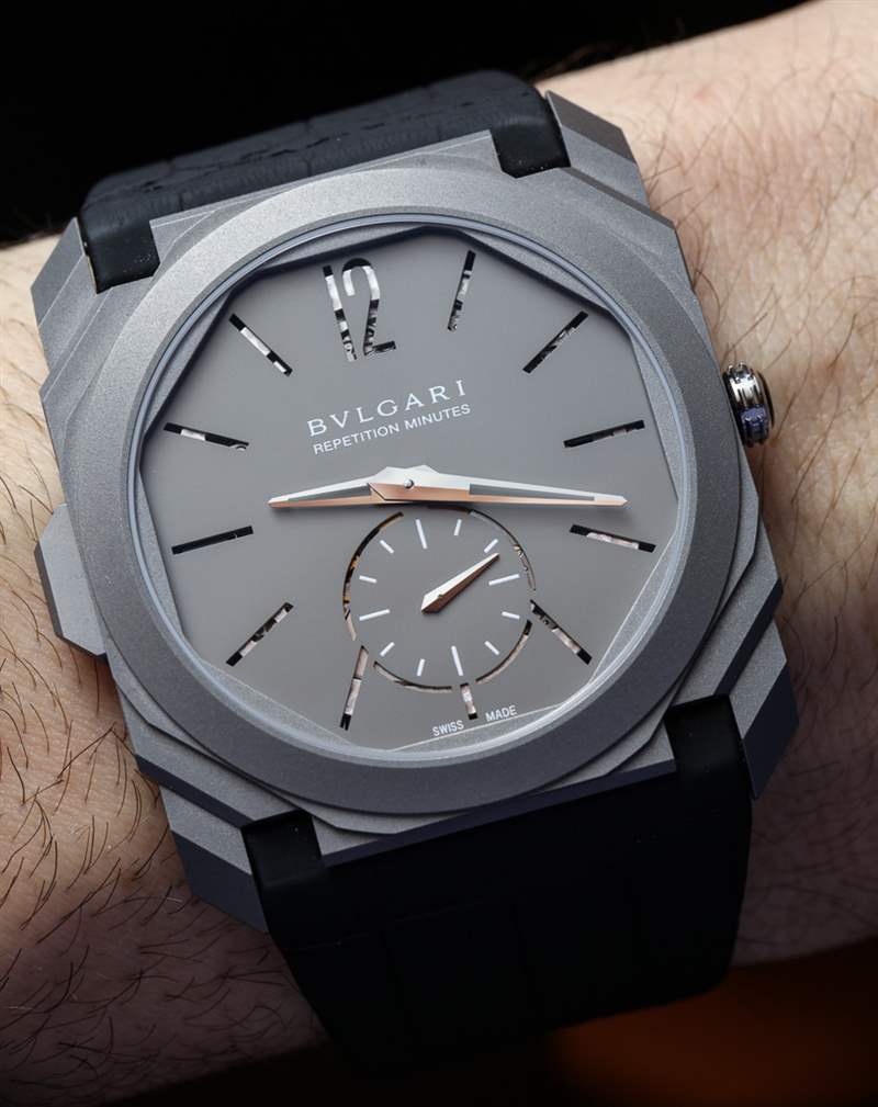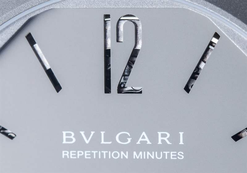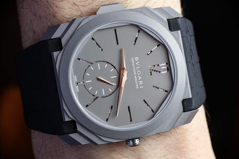 在噴砂鈦中,這種近乎工業(yè)的表面處理并不是大多數人對高端奢華手表的期望。話雖如此,鈦是用于三問報時表的最佳材料之一,因為它的特性不會減弱報時的聲音。黃金或鉑金等貴金屬是響亮的三問表的大敵,而當您想要最響亮、最清晰的聲音時,鋼和鈦是更好的選擇。寶格麗不僅將鈦用于表殼材料,還用于表盤。如果仔細觀察,您會注意到寶格麗 Octo Finissimo 三問報時腕表最有趣的設計細節(jié)之一:鏤空時標和小秒盤。這不僅僅是為了風格,而是作為幫助聲音傳播的一部分,從而充分利用內部空間讓鈴聲產生共鳴。