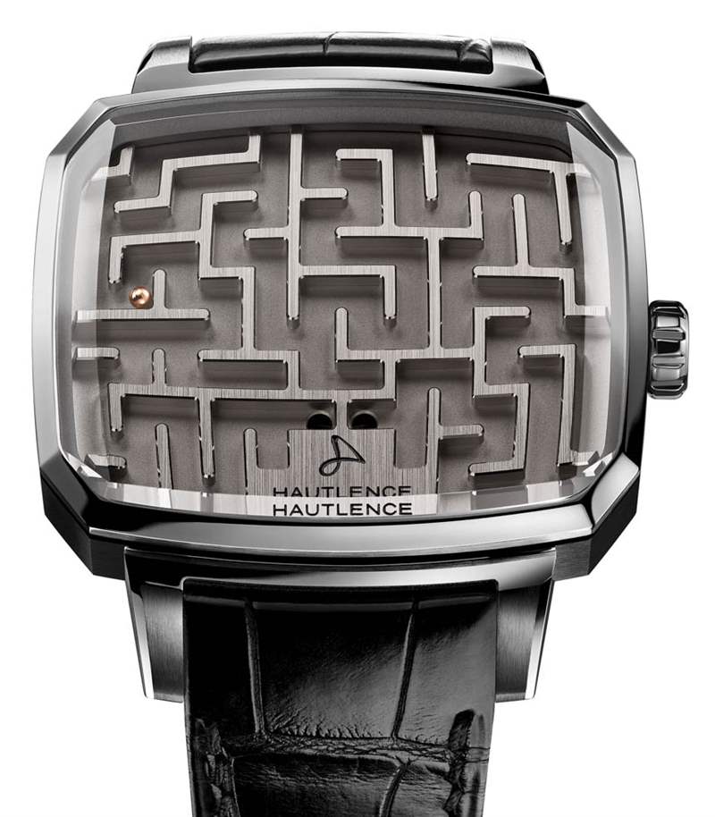 Hautlence 游樂(lè)場(chǎng)迷宮有機(jī)械元素嗎?是的,實(shí)際上。如果您注意到,表盤(pán)上有兩個(gè)小孔。一洞是球進(jìn),一洞是球出。當(dāng)您“擊敗”游戲時(shí),球離開(kāi)表盤(pán),您使用表冠啟動(dòng)一個(gè)小型“機(jī)械升降機(jī)”將其帶回表盤(pán)。表盤(pán)和“機(jī)芯”均經(jīng)過(guò)邊緣倒角(倒角)和拋光等手工裝飾和精加工。表殼附有鱷魚(yú)皮表帶。