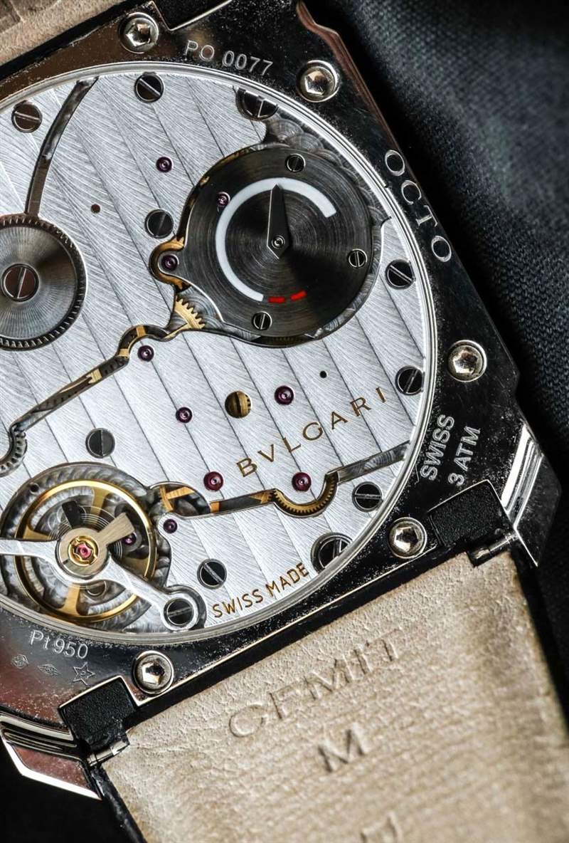 Bulgari Octo Finissimo 內(nèi)部搭載寶格麗自制 BVL 128 手動(dòng)上鏈機(jī)芯,是這款“超薄”腕表的核心。機(jī)芯厚度只有2.23mm(奇怪的是,比Bulgari Octo Finissimo Tourbillon的1.95mm厚的機(jī)芯還要厚一點(diǎn)),真的很薄。Buglari 之所以能夠做到這一點(diǎn),部分原因在于機(jī)芯的寬度——這款手表的另一個(gè)好處是,當(dāng)您通過(guò)藍(lán)寶石水晶底蓋查看機(jī)芯時(shí),它會(huì)填滿(mǎn)大部分表殼。