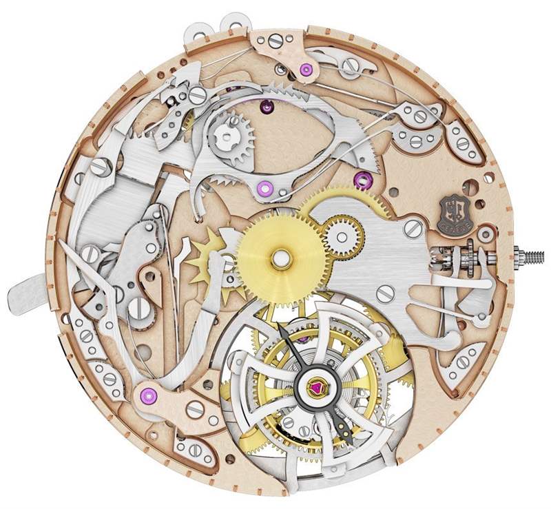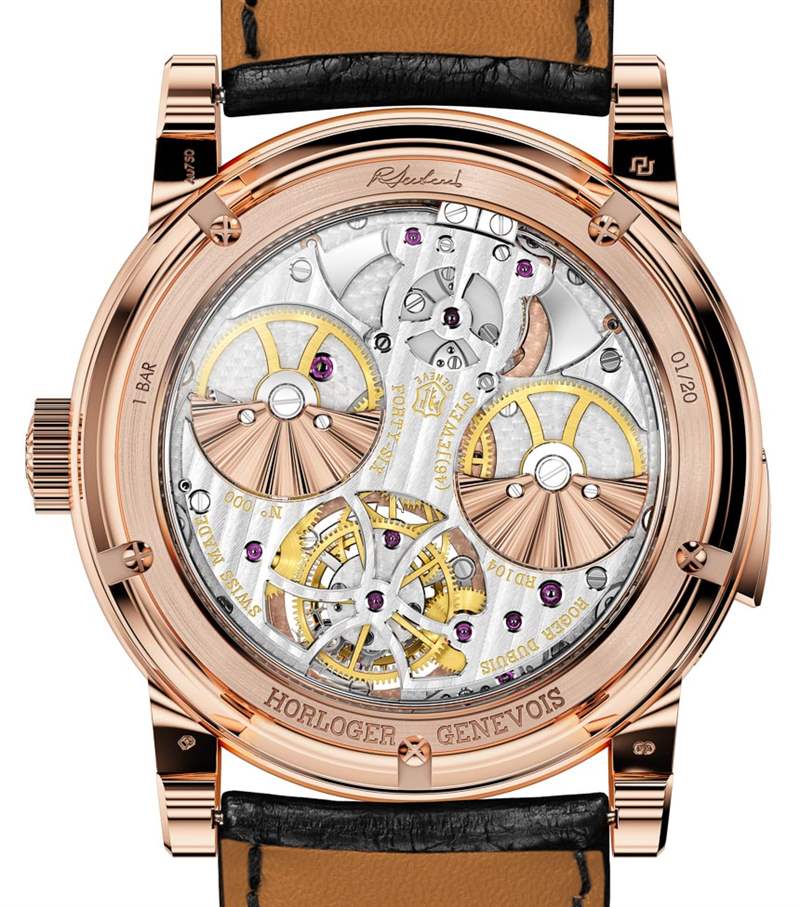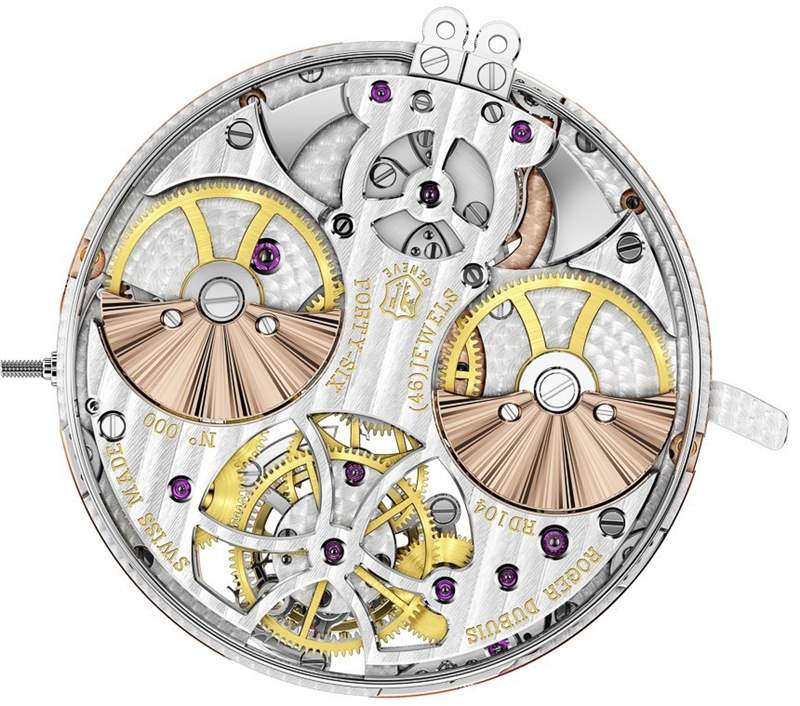 許多手工裝飾是新自制機芯 RD104 獲得日內(nèi)瓦印記 (Poincon de Geneve) 資格的一部分。幾年前,日內(nèi)瓦印記背后的人大大提高了對帶有印記的機芯的要求。機芯除了需要在日內(nèi)瓦州生產(chǎn)并具有一定的性能指標(biāo)外,還需要大量的手工修飾。這意味著大部分單獨的機芯部件必須手工拋光。RD104 機芯包含 434 個零件,這有助于解釋為什么要花費如此多的時間獨自進行精加工。該機芯還以 3Hz 運行,并具有 60 小時的動力儲存。微型轉(zhuǎn)子是玫瑰金色調(diào),但實際上是由鉑金制成的。