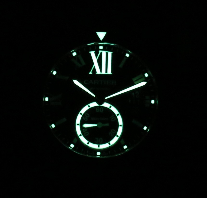 在表盤上,您會看到與標準卡地亞機芯相比有一些變化。乍一看,它們看起來一樣,但并排看時,您會看到重新設計的分鐘軌道、輔助秒盤和增加的夜光量。這并不是說一個比另一個更有吸引力,但重要的是要意識到差異。每個都非常清晰,并提供半個羅馬數字和半個指揮棒時標風格的表盤。