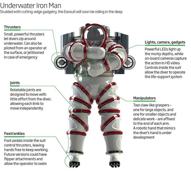 Exosuit 非常糟糕,老實(shí)說,當(dāng)你讓工程師自由設(shè)計(jì)不需要預(yù)算的東西時(shí)就會(huì)發(fā)生這種情況。Exosuit 或多或少是一種可穿戴的潛水服,主要由鋁制成,并包含生命維持系統(tǒng)。有趣的是,它并不是為了潛水那么深而設(shè)計(jì)的,而是讓潛水員可以在水下停留很長(zhǎng)時(shí)間,而不必?fù)?dān)心氧氣不足或減壓?jiǎn)栴}。Exosuit 是大氣套裝,這意味著內(nèi)部壓力與表面壓力大致相同。所以回來的潛水員不需要減壓以避免彎曲。