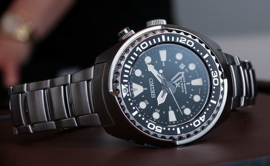 從設(shè)計(jì)的角度來看,我們?cè)谶@里看到了很多事情。Prospex Kinetic GMT Diver 的手表顯然是精工手表,并從其許多著名的潛水表設(shè)計(jì)中汲取靈感。表殼非常符合經(jīng)典“金槍魚”的風(fēng)格,表盤融合了過去 40 年精工潛水表的一系列設(shè)計(jì)。作為一款 GMT 腕表,藍(lán)色或白色的 GMT 指針顯然是受到大約五年前令人驚嘆的Seiko Spring Drive Spacewalk 腕表的啟發(fā)。綜上所述,Prospex Kinetic GMT Diver 腕表具有自己的個(gè)性,2014 年推出三個(gè)版本。