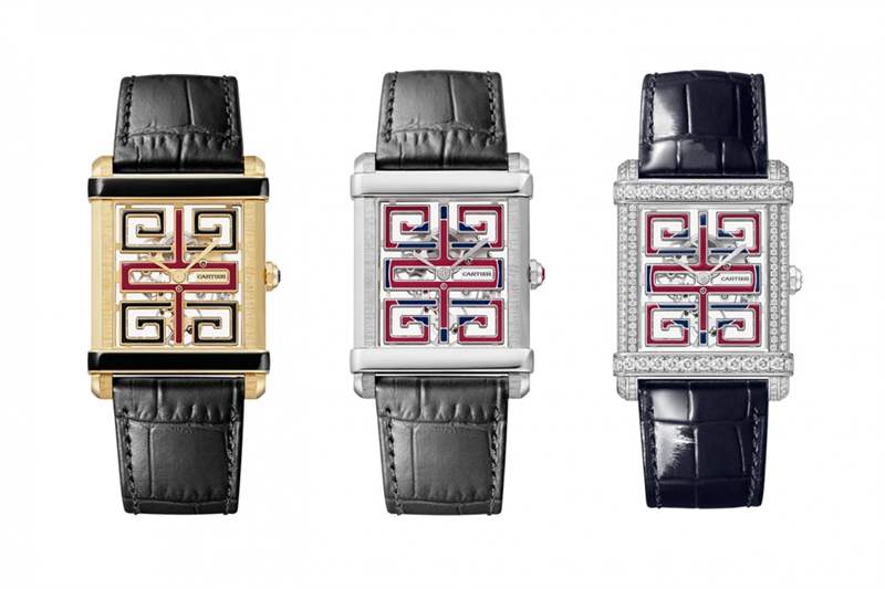 先解構表名法文的「Chinoise」,意思即是「Chinese」,很明顯是腕表注入了中式藝術。其實卡地亞早于1930年已推出Tank Chinoise腕表,當年將中式廟宇建筑風格及寺廟門廊的幾何造型,融入表殼線條上。今年的新表,中式設計及視覺效果變得更突出,將鏤盤鏤空雕刻成中式窗欞,屬中國傳統木造建筑的框架結構,并飾以中國工藝常用的黑色及紅色真漆,而窗欞背后便是品牌全新研發的9627 MC型鏤空機芯。這枚中西合璧的Tank,絕對華美貴氣。腕表備有黃金及鉑金型號,各限量100枚,而鉑金鑲鉆款則限量20枚。