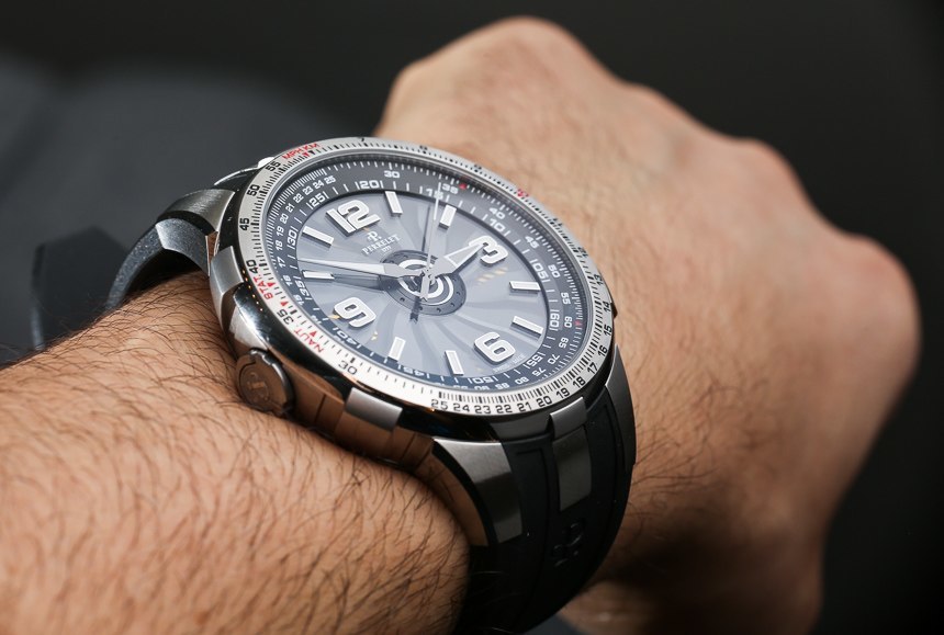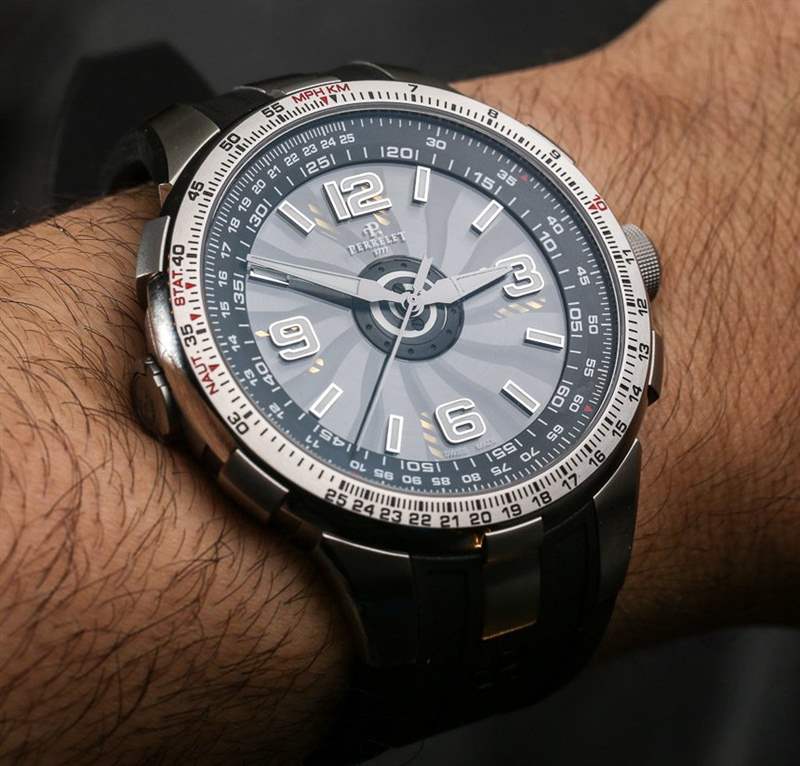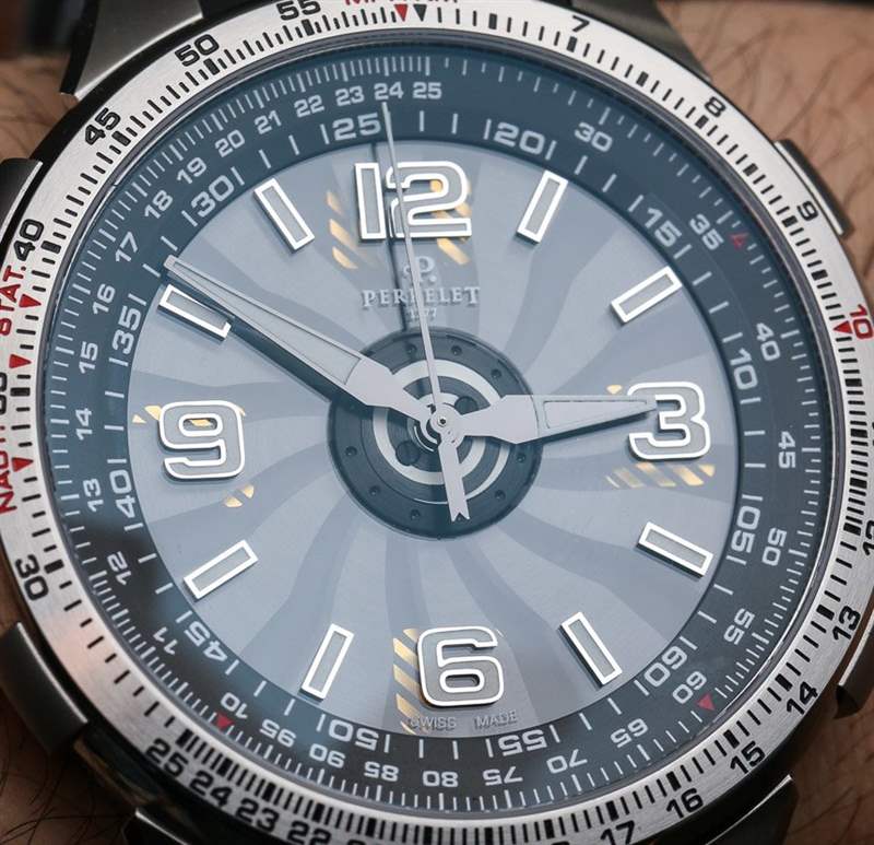 因為這是 Turbine Pilot,所以它當然具有一些飛行員手表功能。Perrelet 為 Turbine Pilot 配備了旋轉滑尺表圈和單獨的表冠以進行調(diào)節(jié)。此功能為整體設計增添了一種技術合法性,并具有另一個殘留元素,使人們喜歡為運動手表支付額外費用但永遠不會使用的出色運動手表功能。