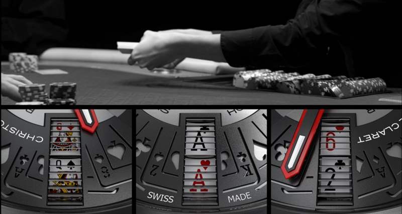 雖然 Blackjack 21 手表在表盤下方使用一系列圓盤來顯示所有紙牌組合,但考慮到顯示所需的組合和紙牌數量增加,Poker 可能需要稍微復雜一些的系統(tǒng)。預覽圖像不僅暗示了我們在游戲手表系列中已經習以為常的相似美學風格(包括我喜歡的那些鑲有紅寶石的指針),而且看起來像旋轉百葉窗式顯示器,每個顯示器可以顯示三個圖像控制板。