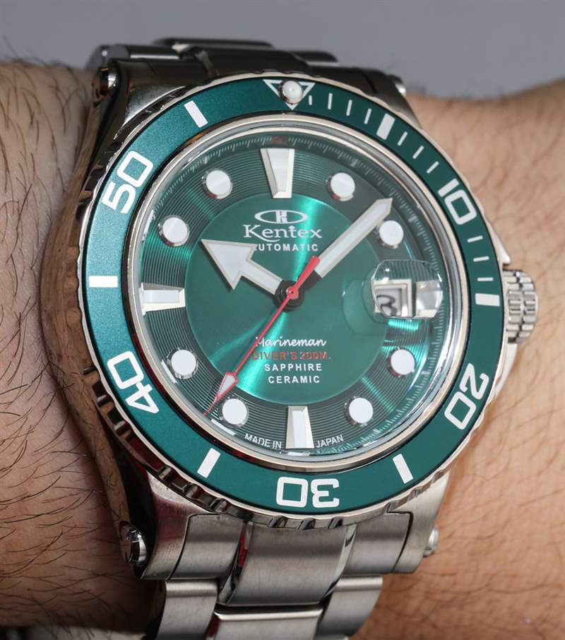 新款 Kentex Marineman 寬 45 毫米,采用不銹鋼或 IP(離子鍍層)黑鋼表殼。實(shí)際上兩者看起來都不錯。在日本手表中很難找到 PVD ??涂層工藝,但他們的 IP 處理通常非常好。雖然我更喜歡日常佩戴的拉絲/拋光鋼表殼,但黑色的 Marineman 表殼看起來很酷。我不確定是否所有表盤/表圈顏色版本都提供黑色。同樣重要的是要注意,并不是所有的顏色版本都在這篇文章中被描繪出來。據(jù)我所知,新款 Marineman 腕表提供黑色、黑紅、綠色、藍(lán)色和白色珍珠貝母表盤版本。