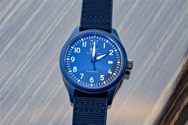 陶瓷對于萬國來說并不是什么新鮮元素,早在1986年的時(shí)候他們推出的達(dá)文西萬年歷計(jì)時(shí)碼表ref.3755用的就是白色陶瓷表殼。由這種材質(zhì)打造的外殼具有很多優(yōu)點(diǎn),如耐刮擦、防褪色、硬度高、比鋼輕等。但相對的,就是它制造起來比較難,并且也比較脆。這里這款表的深藍(lán)色啞光陶瓷表殼便是復(fù)雜制造工藝的產(chǎn)物,它是通過將氧化鋯粉末與金屬氧化物的混合物塑形,然而置于熔爐中燒結(jié)而成的。陶瓷親膚的質(zhì)地及觸感,連同剛剛提到的對劃痕和褪色的強(qiáng)抗性,對于日用表而言都是加分項(xiàng)。不過與其它萬國表一樣,表冠要是上陶瓷那太費(fèi)勁了,所以這里用的還是精鋼把頭,這也讓它在一定程度上回歸了工具的范疇。