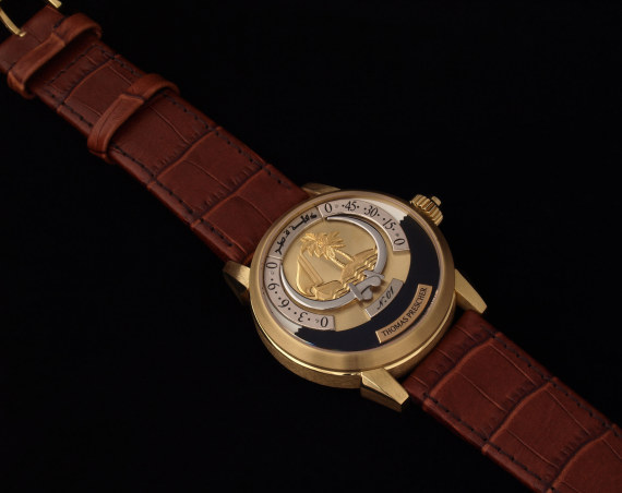 托馬斯被要求在他的設計中更具區域性。不知道他為什么選擇卡塔爾,但這激發了他以國家為主題作為設計,以他最好的品質創作限量版系列。Tempusvivendi系列使用兩個相鄰的逆跳刻度來顯示小時和分鐘。在這里,表盤的設計基于卡塔爾的徽章 – 您可以在這里看到。托馬斯能夠使這兩把劍成為逆跳刻度的時針和分針。也許是徽章的便捷布局導致他將卡塔爾作為新手表的基礎?!
