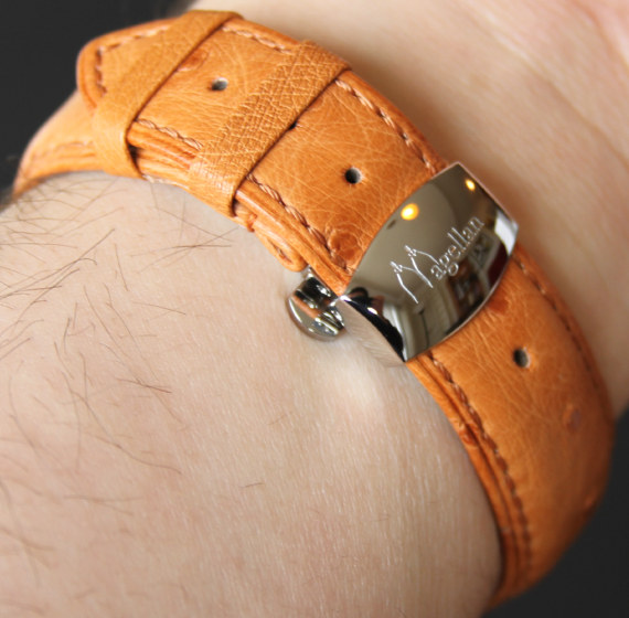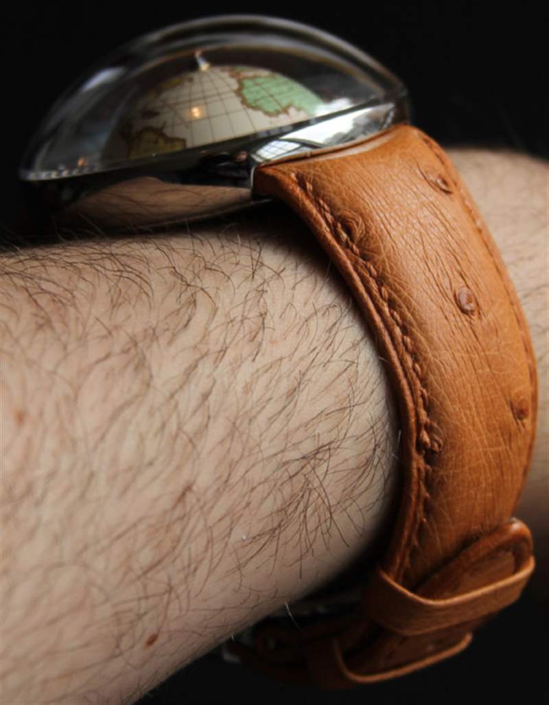 您會看到麥哲倫1521 NH,不銹鋼材質(zhì),蜂蜜色鴕鳥表帶。這款手表也有18k黃金可供選擇,還有一些其他表帶可供選擇。如果您真的很笨拙,您可以選擇在地圖上顯示屏上填充大陸的珠寶版本的手表。光滑的側(cè)面外殼寬 43 毫米,高 19 毫米。您可以說,大多數(shù)表殼的制造都復(fù)雜且昂貴,無法與金屬表殼無縫集成的圓頂藍寶石水晶。它帶來了令人難以置信和令人滿意的結(jié)果。此外,手表上的金屬拋光得非常好。只是一個完美的鏡面拋光,上面有非常漂亮的飾面。