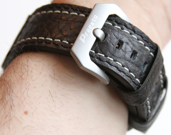 為手表提供動力的是日本Miyota 8245自動機芯,該機芯提供手動上鏈功能(在所有日本自動機芯中都不是理所當然的)。24毫米寬的表帶是較厚的皮革,上面有皺紋紋理和白色縫線。我喜歡“迷你沛納海”風格的表扣,上面刻有Praesto的名字。在我看來,表帶更適合其他兩個版本的現代飛行員 – 因為它也帶有黑色表盤或黑色表盤,帶有PVD黑色表殼版本。對于藍色表盤,我正在考慮其他表帶與手表搭配使用可能很好。我正在考慮一款藍色橡膠表帶,它將更符合表盤的現代運動性(和顏色)。