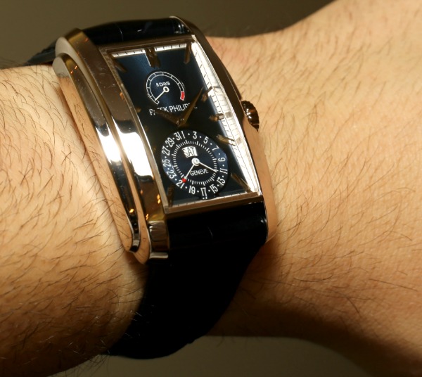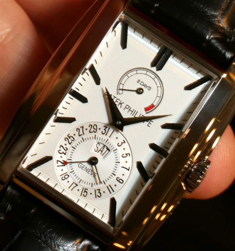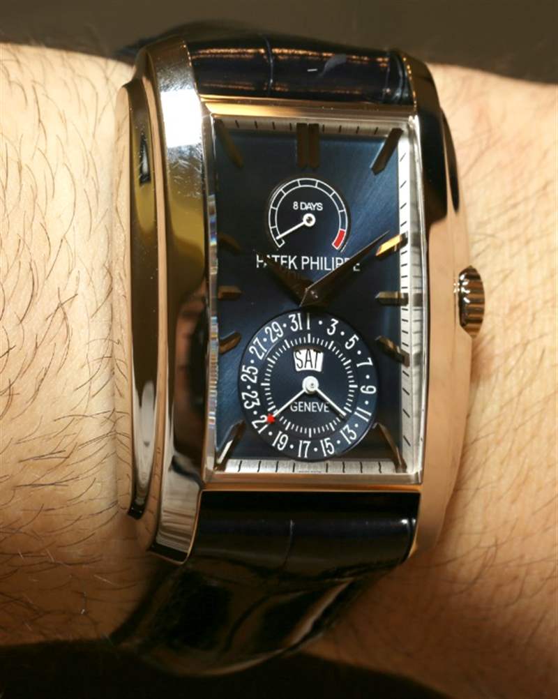很難抗拒“啞光藍(lán)色旭日形”表盤(pán)(如百達(dá)翡麗的稱(chēng)呼)的魅力,但加上拋光的太妃糖指針,在光線(xiàn)下的易讀性并不理想。盡管如此,盡管矩形表盤(pán)的比例令人尷尬,但就可讀性而言,百達(dá)翡麗在指針和應(yīng)用時(shí)標(biāo)方面做得很好?!般y白色蛋白石”表盤(pán)非常棒。非常輕,它與那些啞光黑色混合得非常好。百達(dá)翡麗是目前生產(chǎn)這些深黑色但細(xì)節(jié)豐富的黑色指針和時(shí)標(biāo)的王者。