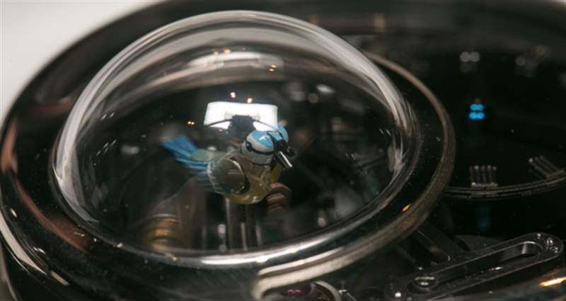 47 毫米寬 18k 白金表殼側面的縫隙可讓聲音從機芯內部逸出,活塞式哨子發出鳥鳴聲。這個迷人的鳥的原型版本還有一些工作要做,包括改進和完成機芯,為歌曲提供更強勁的聲音,以及為表殼添加適當的表冠(不需要工具來為自動裝置上鏈)最終產品)。