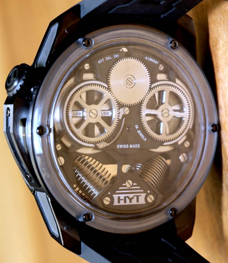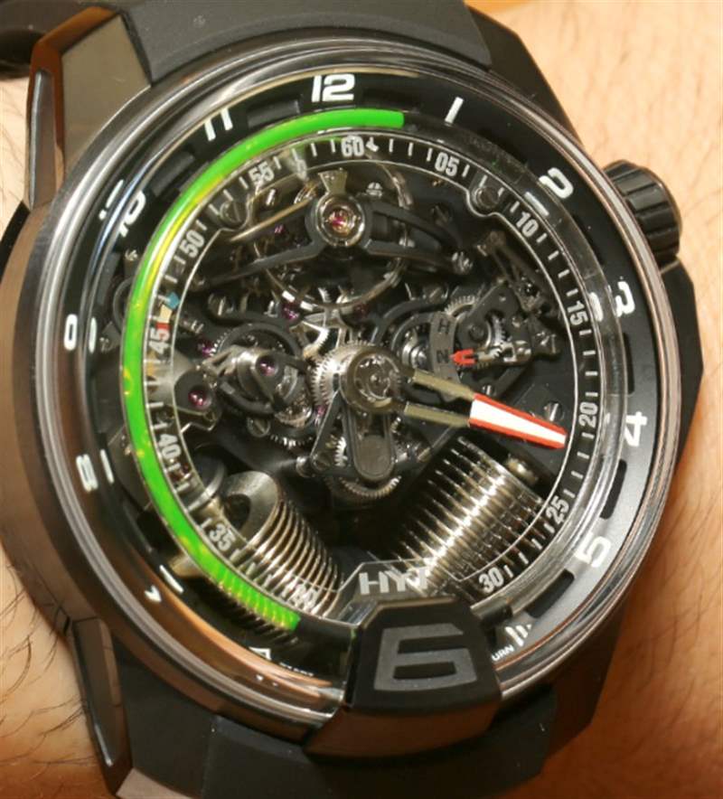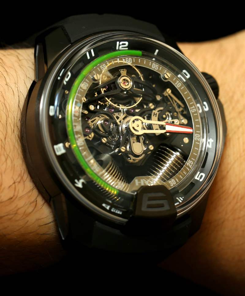 如果您閱讀過我們首次發(fā)布 H2 的文章,您就會了解其近 49 毫米寬的尺寸和黑色 DLC 涂層鈦金屬表殼。在手腕上,它不僅感覺像一個小型發(fā)動機,其新對角對齊的波紋管的方向就像發(fā)動機中的活塞。波紋管是液體小時系統(tǒng)的一部分,并與運動一起使用壓力移動液體以指示小時。分鐘顯示在一個更大的中央分針上,它完全跳過表盤的底部,就好像它根本不存在一樣。它是跳分針的一種形式。表盤頂部附近還有一個大的外露擺輪。它看起來很棒,但如果他們將陀飛輪扔進鍋里,很可能已經(jīng)毀了。廣告留言廣告信息結(jié)束