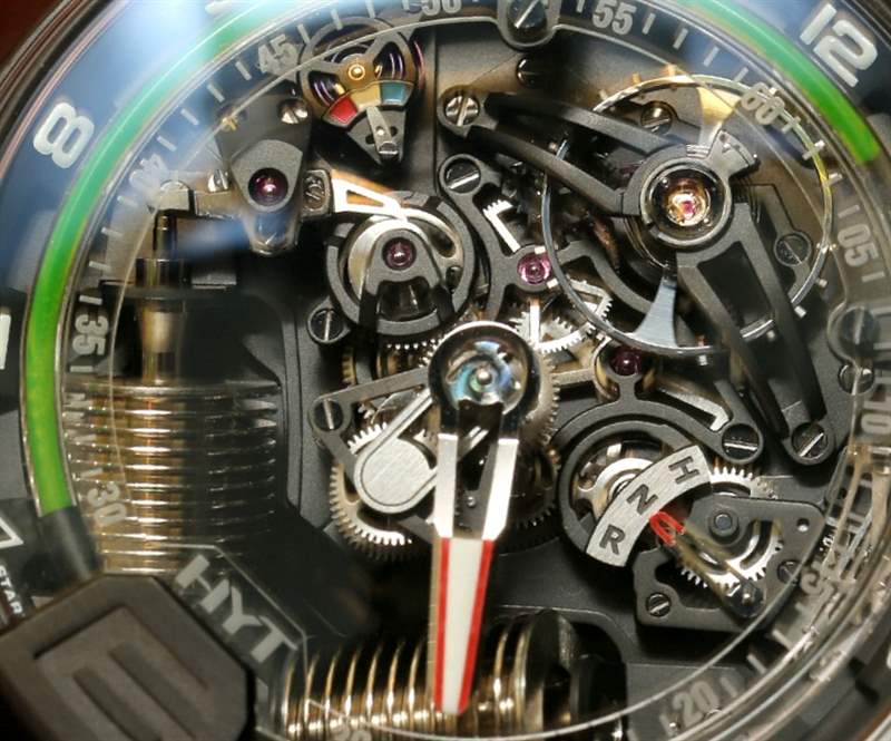 Audemars Piguet 的 Giulio Papi 負責(zé) H2 的機芯。Perriard 認為他是設(shè)計天才,尤其是在制作深感復(fù)雜的機芯、突破想象力的極限時。例如,由于 HYT H2 在數(shù)小時內(nèi)使用液體,因此它會受到外界溫度的影響。那么他們做了什么?生產(chǎn)一種特殊的溫度調(diào)節(jié)器,確保手表在大多數(shù)情況下都能完美運行。不過,表盤上有一個微型溫度計,可以告訴您手表是否處于理想的工作溫度,或者您是否需要稍微冷卻(或加熱)它。