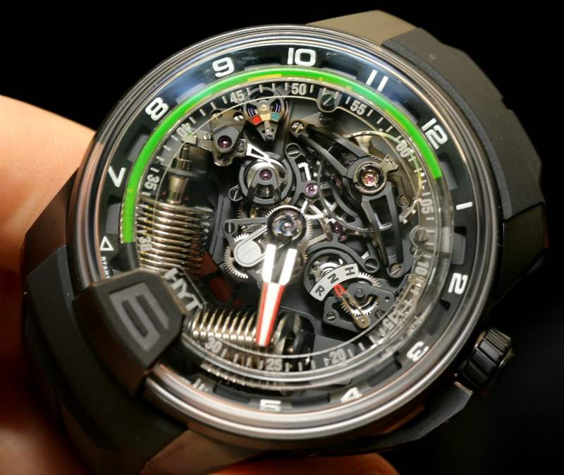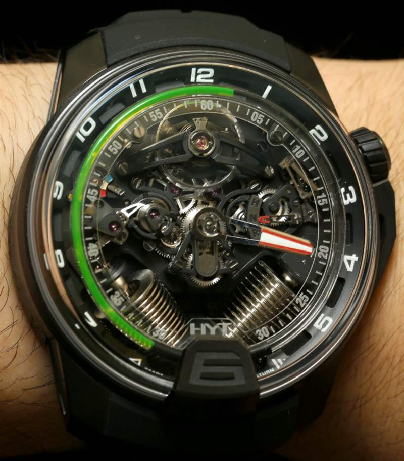 我們與HYT手表的會面?是在2013年Baselworld的第一天很早的時候。我們在HYT品牌展位還沒有完全布置好之前就到了。我們周圍的人正在展示并安排相鄰的展位,以迎接 2013 年的媒體、買家和公眾。HYT 首席執(zhí)行官 Vincent Perriard 正忙著檢查他即將舉行的新聞發(fā)布會的麥克風(fēng),并確保時髦的黑色和綠色展臺周圍的小細節(jié)恰到好處。這是 HYT 第二年參加 Baselworld,這是鐘表行業(yè)資深人士 Perriard 極其熟悉的貿(mào)易展覽活動。今年新展臺更大更好,他推出了他們的第二個主要作品H2(在 aBlogtoWatch 上首次亮相)