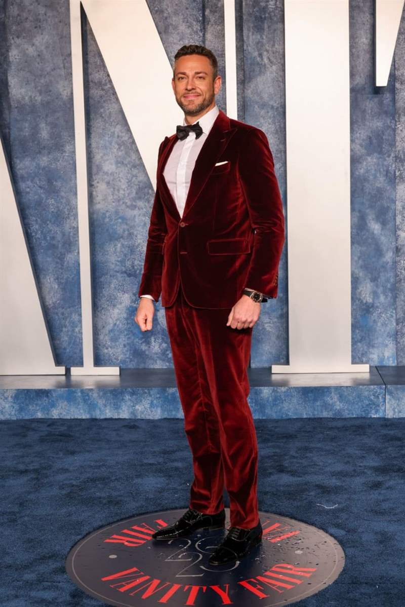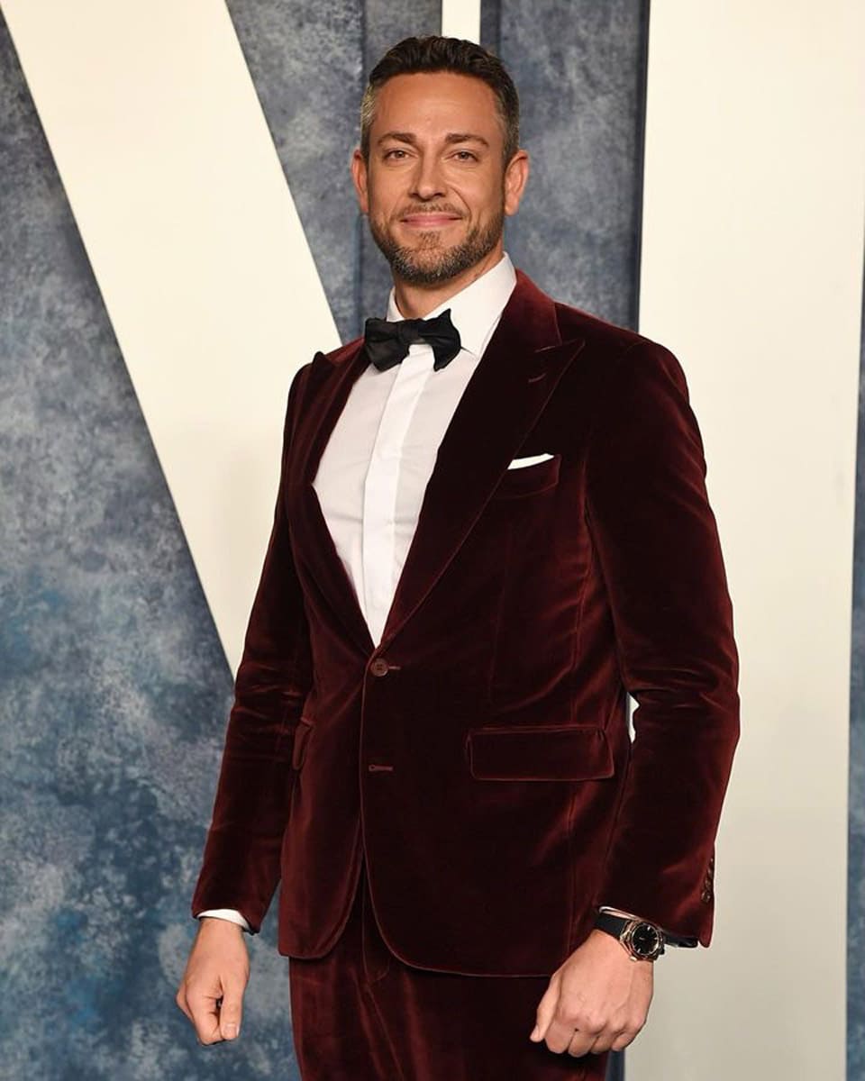 ▲Zachary Levi在奧斯卡獎上佩戴宇舶經典融合系列手表搭配他的酒紅色絨質西裝。