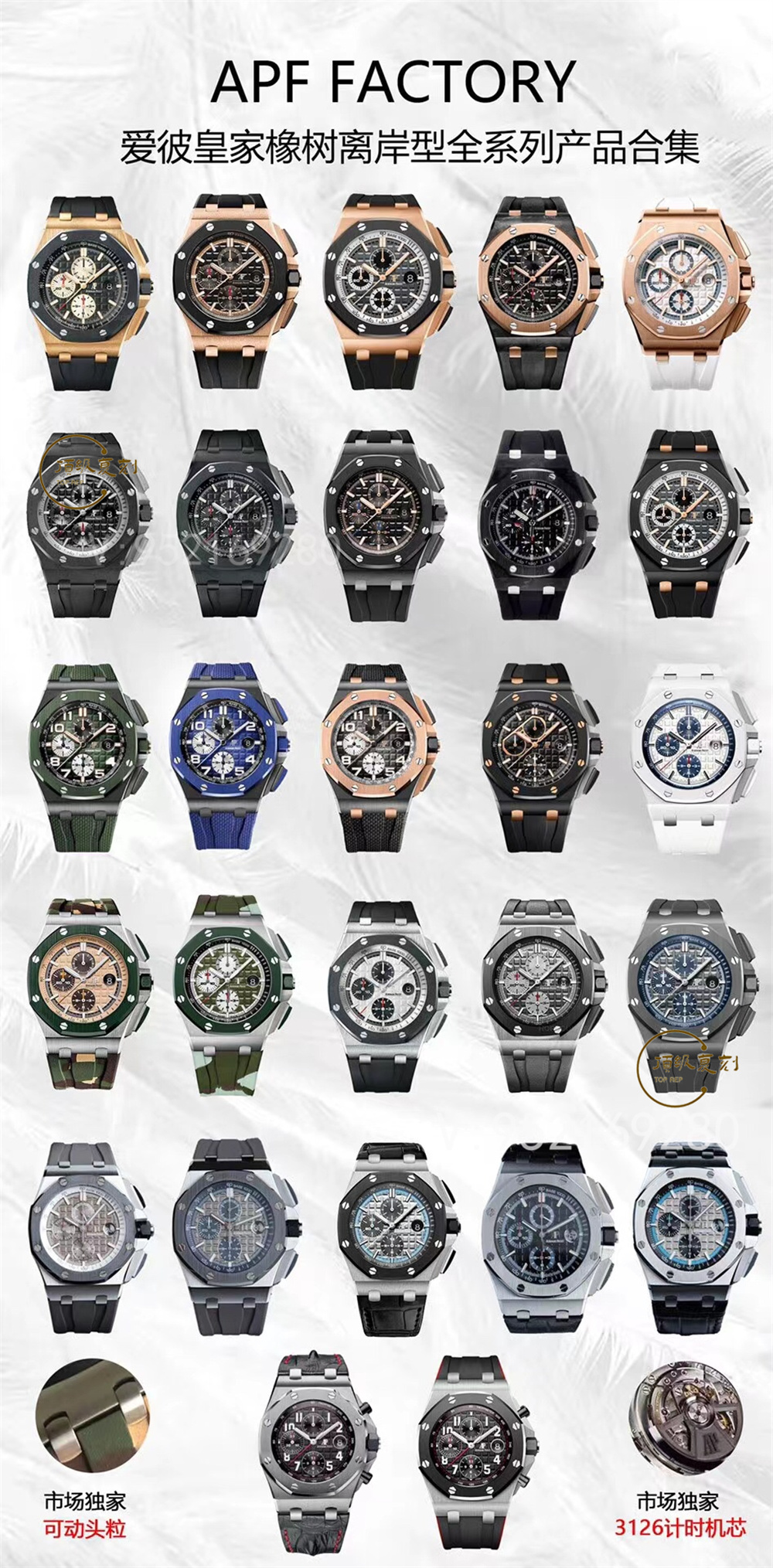 這個APF就是JF廠隕落后出來的老板,除了APF除外,還有好幾家做這款離岸型AP的,總體做工都接近。APF方面基本是基于老款的JF去改良一下,比如說頭粒的活動范圍等。在機芯篩選上也沒以前JF計時AP多問題。老款JF廠出貨基本10個有3-4個要更換的,機芯問題較多缺乏質檢。作為APF廠提供的款式已經夠玩了,本文貼一下廠家提供的配色。