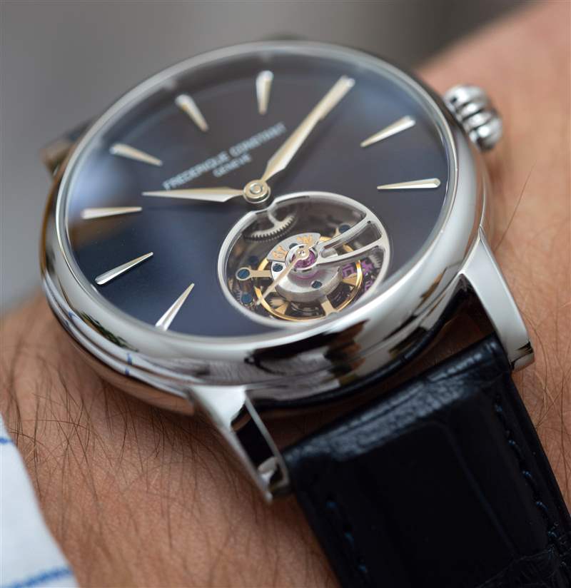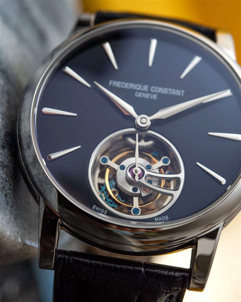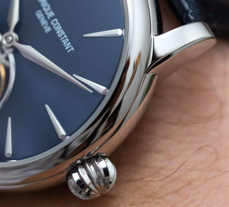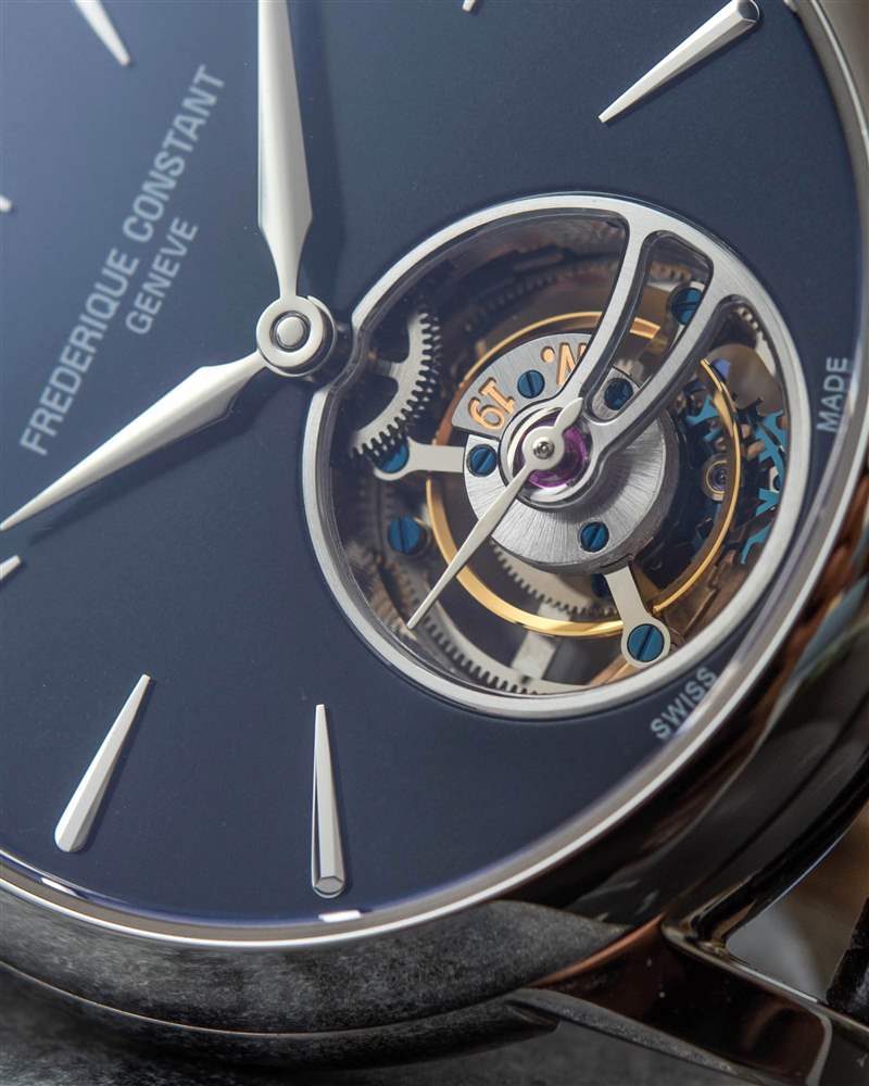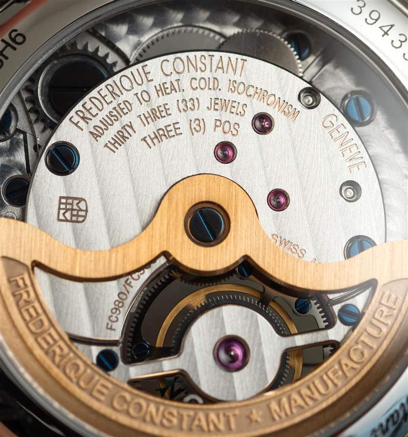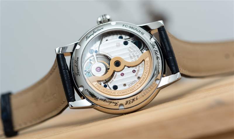 巨大的指針以其體積、復(fù)雜的形狀和明顯的縱向彎曲給人留下了深刻的印象。它們也是 FC-980 自產(chǎn)機(jī)芯的力量展示,該機(jī)芯不僅承載著巨大的時(shí)針和分針,還承載著陀飛輪組件。動(dòng)力儲存只有區(qū)區(qū)38小時(shí),很短,但至少是自動(dòng)補(bǔ)充的。FC-980機(jī)芯調(diào)校為熱、冷、等時(shí)、三方位,但沒有說明是否是經(jīng)過認(rèn)證的天文臺表。