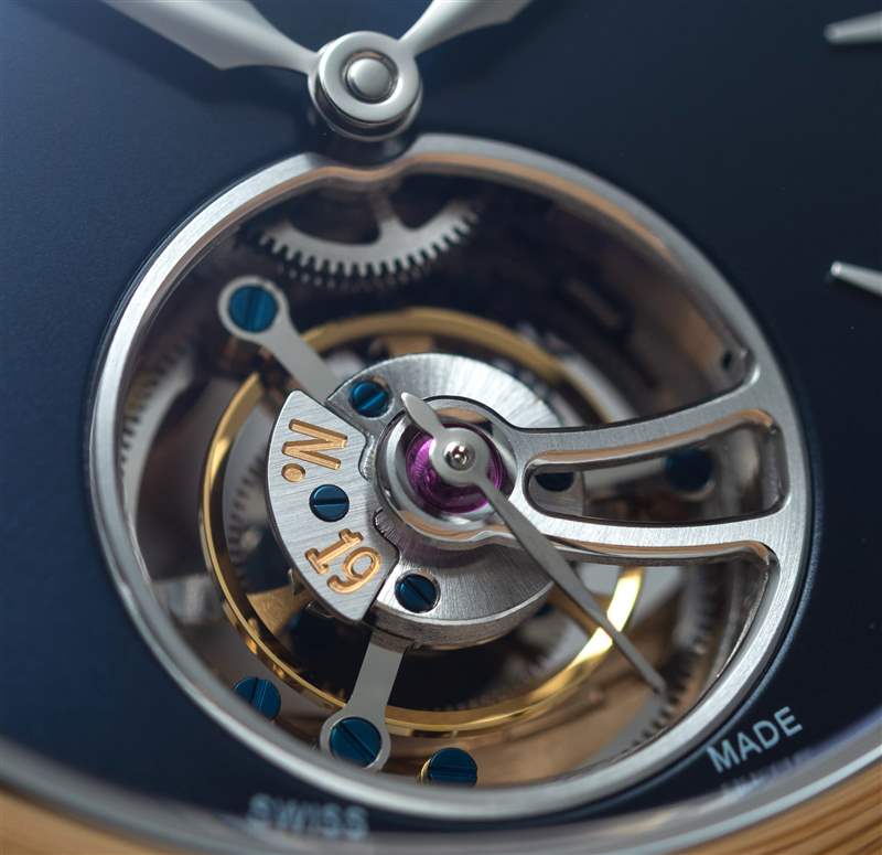 它擁有瘋狂移動(dòng)的擺輪——拋光的金色色調(diào),帶有陡峭的倒角,觸感非常好——其快速擺動(dòng)幾乎無法辨認(rèn),而三臂框架則跟隨每一次滴答聲并以彈性的方式滑動(dòng)。優(yōu)雅時(shí)尚,60 秒畫一圈。這些同軸運(yùn)動(dòng)確實(shí)很巧妙,有一個(gè)小擒縱輪在周圍運(yùn)轉(zhuǎn),就好像它著了魔一樣。從上方固定陀飛輪組件的框架和鏤空夾板(如果它的兩端固定在機(jī)芯上,則可以稱為夾板)經(jīng)過精心打磨,邊緣經(jīng)過斜角和拋光處理,甚至在最深處還為大顆寶石設(shè)計(jì)了拋光埋頭孔。中心。它是秩序、平衡和機(jī)械美的縮影。