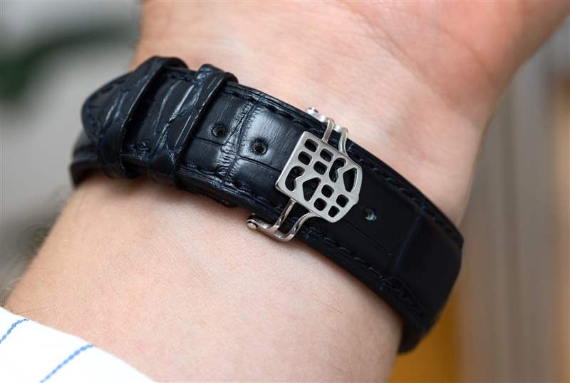 戴在手腕上,自制經(jīng)典陀飛輪腕表給人一種真正優(yōu)雅的感覺,專為日常佩戴而設(shè)計(jì)——也就是說,在辦公室里日常佩戴。這不是“看看這個(gè)!”?陀飛輪的展示只是為了將其置于敲詐比特幣百萬富翁沖動(dòng)購買者的范圍內(nèi)。這是一款相對低調(diào)、內(nèi)斂的手表,看起來復(fù)雜而昂貴,但絕不令人討厭或礙眼。人們很容易想象跨國公司的高級經(jīng)理或工程師會穿著它。簡潔的細(xì)節(jié)包括,單個(gè)生產(chǎn)編號不僅可以在底蓋上讀取,還可以在陀飛輪框架的頂部讀取——功能性機(jī)芯組件具有如此程度的定制是很少見的。擒縱輪上刻有康斯登標(biāo)志,閃爍著紫色和藍(lán)色的光芒,這是因?yàn)樗怯晒柚瞥傻摹T撈放剖褂玫牟粌H僅是這個(gè)組件 – 了解他們的 40Hz(是的,四十赫茲)這里采用硅制成的整體式擒縱機(jī)構(gòu)。折疊扣上還帶有品牌標(biāo)志,這是一個(gè)不錯(cuò)的主意,盡管執(zhí)行起來并不像某些人想象的那么清晰。