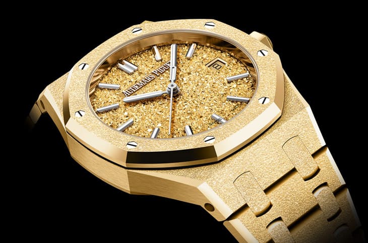 新款皇家橡樹霜金自動表提供黃金與白金兩種款式,尺寸為34mm,適合不同佩戴者的喜好。表殼與表帶均采用霜金工藝修飾,展現出與眾不同的奢華感。