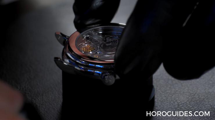 Philip Barat 進一步解釋,擴音模組中最核心的元件是藍寶石震動晶圓,為了達到最大的震動效率,一方面必須和聲音杠桿穩固地連接以傳導音簧的震動,同時震動晶圓必須擁有完全自由運動的空間才能充分震動,而晶圓和后底蓋之間必須保持0.2毫米的間距,才能獲得最理想的空氣壓縮率。