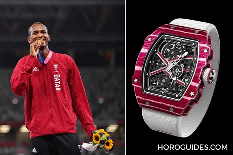 Mutaz Essa Barshim手上配戴的Richard Mille RM 67-02 Mutaz Essa Barshim-High Jump跳高自動上鏈超薄腕表是畫面中的另一個亮點,這只腕表是Richard Mille為他所特別設計,配色靈感得自卡達國旗。