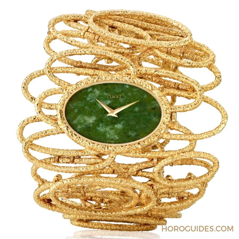 還有一只經常被昵稱為「賈姬表」的古董作品,翡翠表盤、表圈的四方位置分別以圓形切割的祖母綠點綴;此表款曾為賈桂琳.甘迺迪所擁有,也是此次展覽的另一件亮點。這只作品正是Piaget日后打造Extremely Piaget系列腕表的靈感來源。