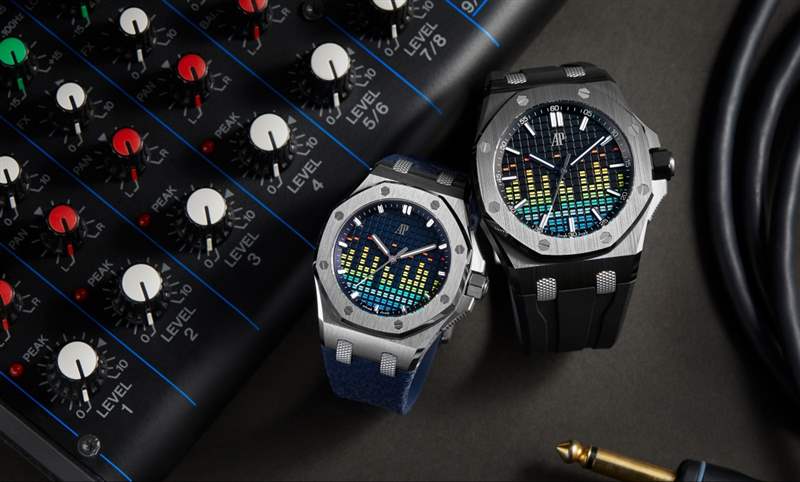 愛彼在這幾只限量表款的表盤大做音樂,在Tapisserie格紋表面加上移印的彩色均衡器圖案。從音樂里獲得的靈感,不止呈現(xiàn)在表盤上,處處藏著錄音室里可見的元素,好比滾花表帶接口模仿音響插頭,表冠護橋則令人聯(lián)想到混音器的推桿,轉換手法絕妙。