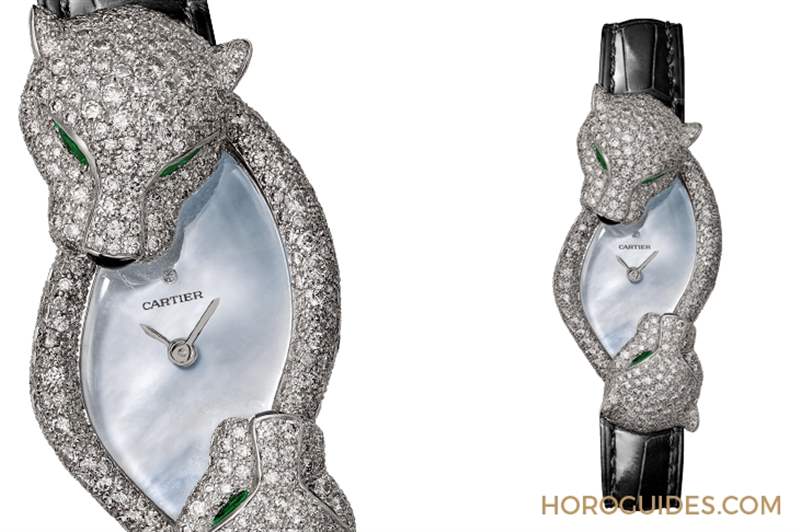 在La Panthère這款腕表上,Cartier把美洲豹最具神秘魅態的肢體語言,抽象化地化為柔順的鏈帶。落在貴金屬材質巴黎釘紋之間的黑色尖晶石金字塔象征美洲豹身上的美麗斑點,兩者銜接出一道曲線柔和的雙環設計,配戴起來十分舒適。與其說它是時計,不如將它視為一件帶有時間指示功能的珠寶,溫柔又饒富個性地蜷伏在配戴者手腕,閃閃發亮。