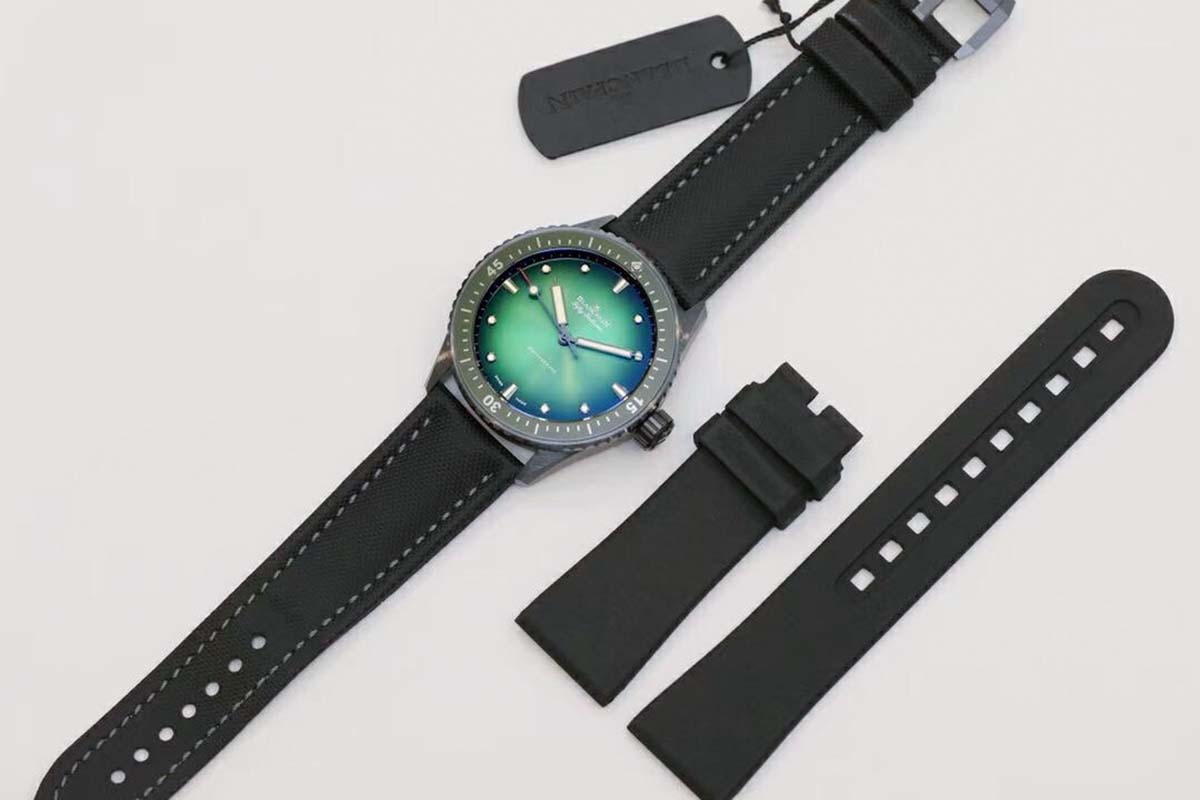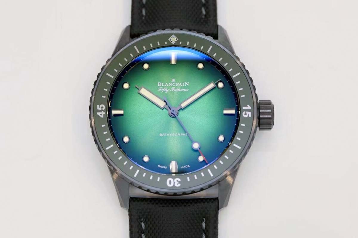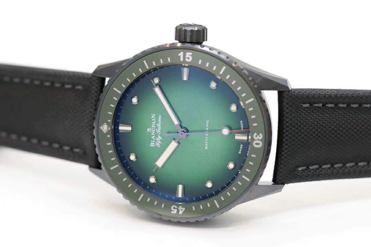 GF廠寶珀五十噚系列5005極光綠復刻腕表綠色表盤和綠色陶瓷表圈。綠色表盤配以磨砂綠色陶瓷表圈和比照鮮明的液態金屬分界,并配有寶珀黑色黑色北約表帶,與表殼的深色陶瓷外觀奇妙地調配在一起。12點方位的發光點索引是對1950年代原始五十Fat手表中運用的指針的忠實再現。表殼直徑43.6毫米與原裝共同,滿足了大部分男士手腕的佩帶需求。表殼由黑色陶瓷制成,帶有傾斜的表耳和緞面拉絲外表。