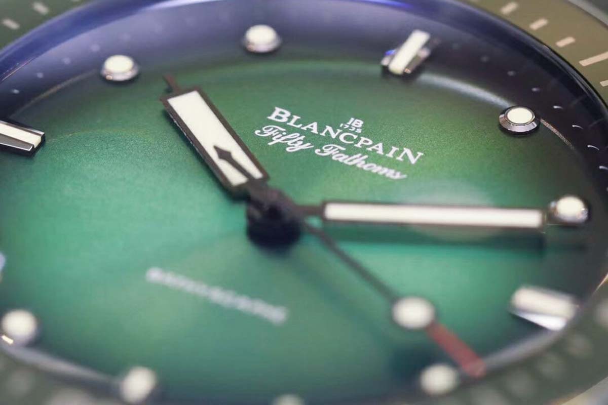 眾所周知五十噚的夜光效果特別棒!GF廠寶珀五十噚系列5005極光綠復刻腕表表盤12點位下方的Logo部分并沒有呈現毛刺,或者堆疊的現象。簡略的大三針規劃,給這款腕表增添了不少魅力。最長指針為秒針,前端增添了一抹亮紅,并且圓環的地方進行了夜光的填充。兩根粗胖的指針是分針與時針,也都是非常用心的填充了夜光資料,使得此腕表在黑私自也仍然能夠明晰精確地讀取時刻。