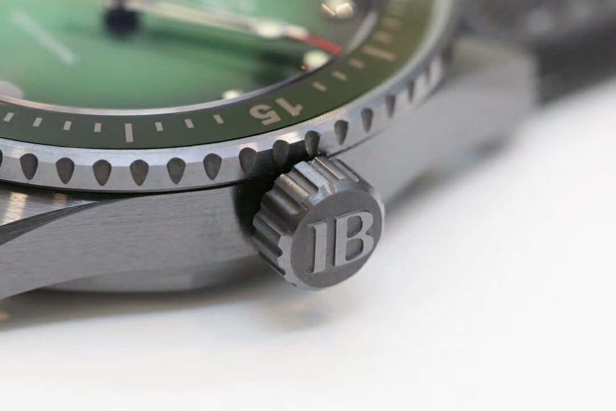 GF廠寶珀五十噚系列5005極光綠復刻腕表表冠選用三角坑紋規劃,防滑的同時愈加便利調時刻,非常便捷。頂端鑲刻了寶珀“JB”logo,極具立體感,展示品牌風范。